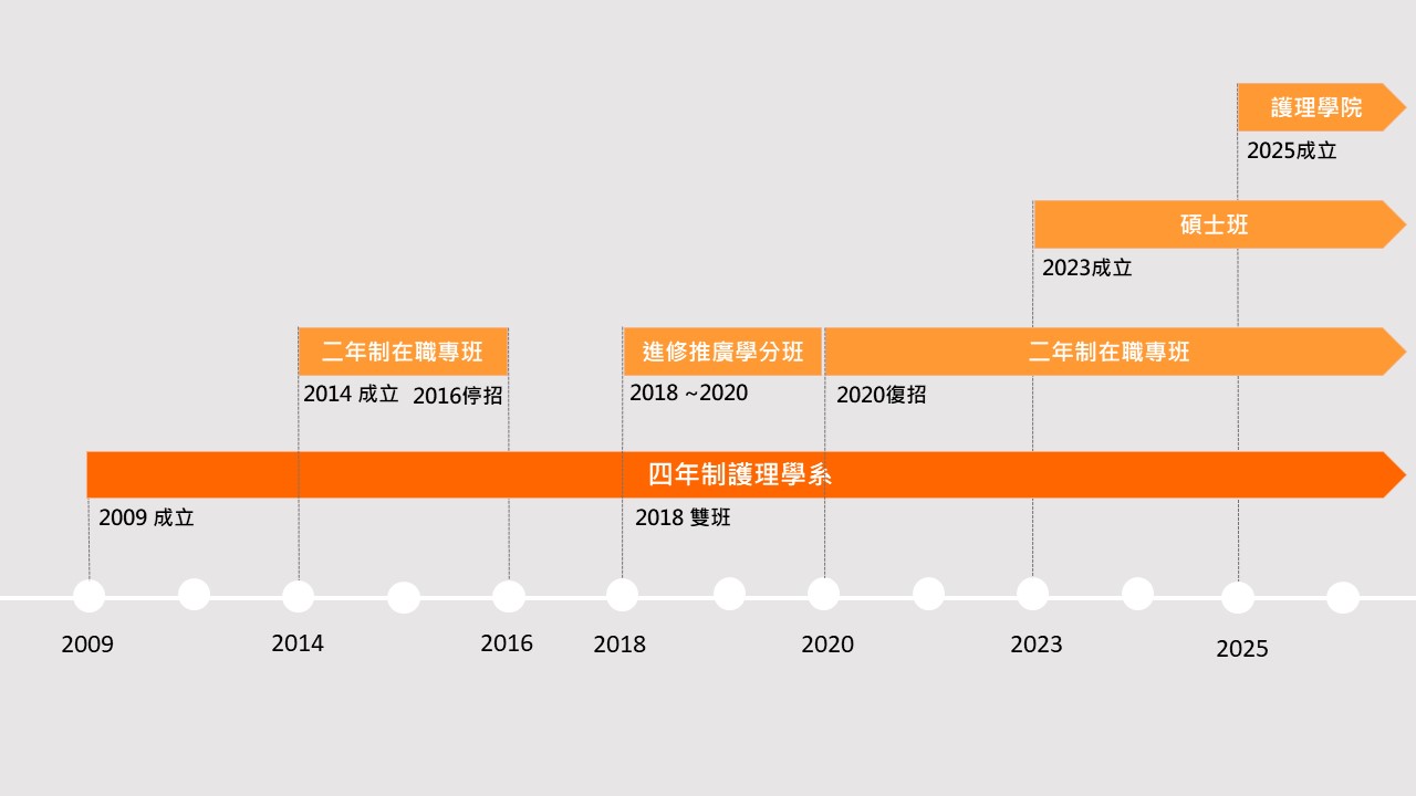 ![]() 98年獲教育部核准成立護理學系,招收第一屆新生40名。 103學年度增設護理學系二年制在職專班,每年招生一班40名。 (105學年報部核准暫停招收,109學年度報部核准復招) 107學年度護理學系開始增為兩班,每年共招生80名。 112學年度增設護理學系碩士班。 114年8月1日設立護理學院。 |